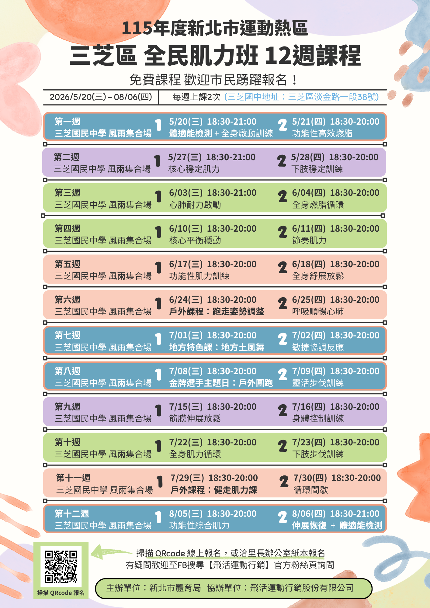 本次課程 只需報名一次 就可以免費參加12週課程,以上為課程表。