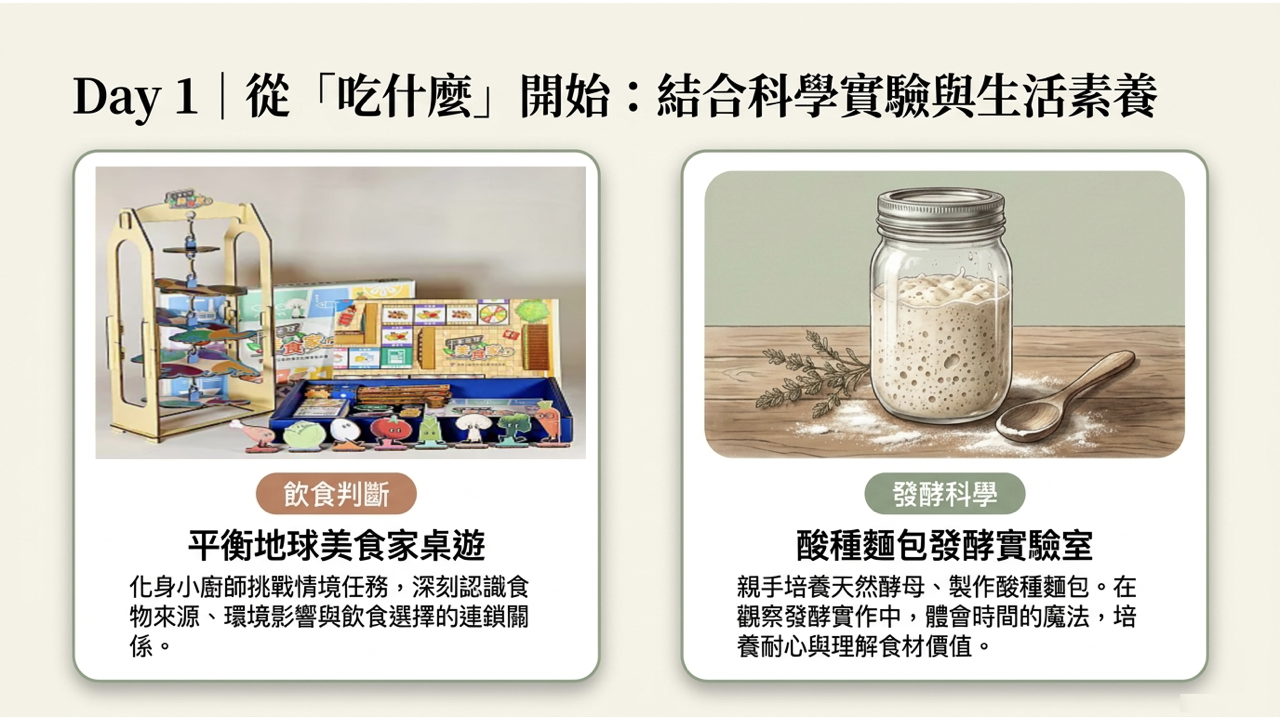 在本次營隊中,灃食負責整體食育課程設計,結合科學與生活素養,引導孩子不只學會料理,更理解怎麼吃、為什麼這樣吃,建立對自己健康負責的能力。