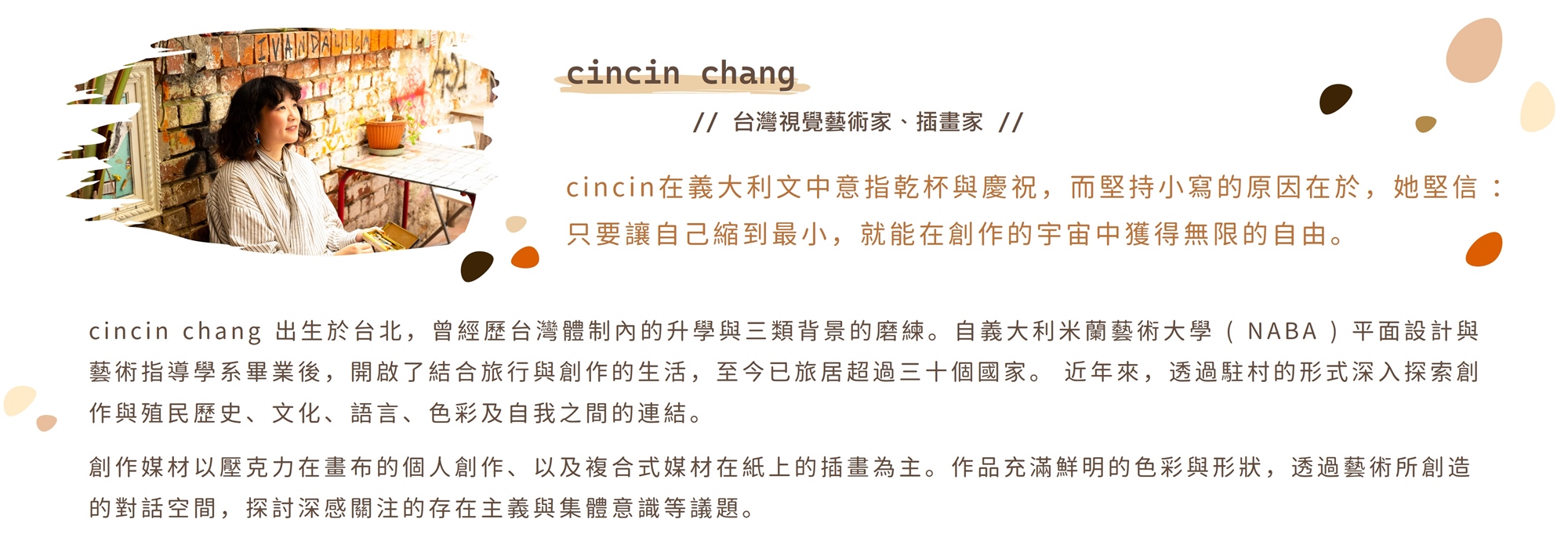從3歲的夢想到現在,這條彷彿走了一輩子的創作路,充滿迷惘、自暴自棄、卡關與逃避,但正因為死皮賴臉地堅持在想做的事情上,那些灰暗的時刻,終成為閃閃發亮的模樣。本場講座邀請cincin聊聊她創作至今的體悟,以及如何透過持續創作,讓作品呈現獨特的生命力。