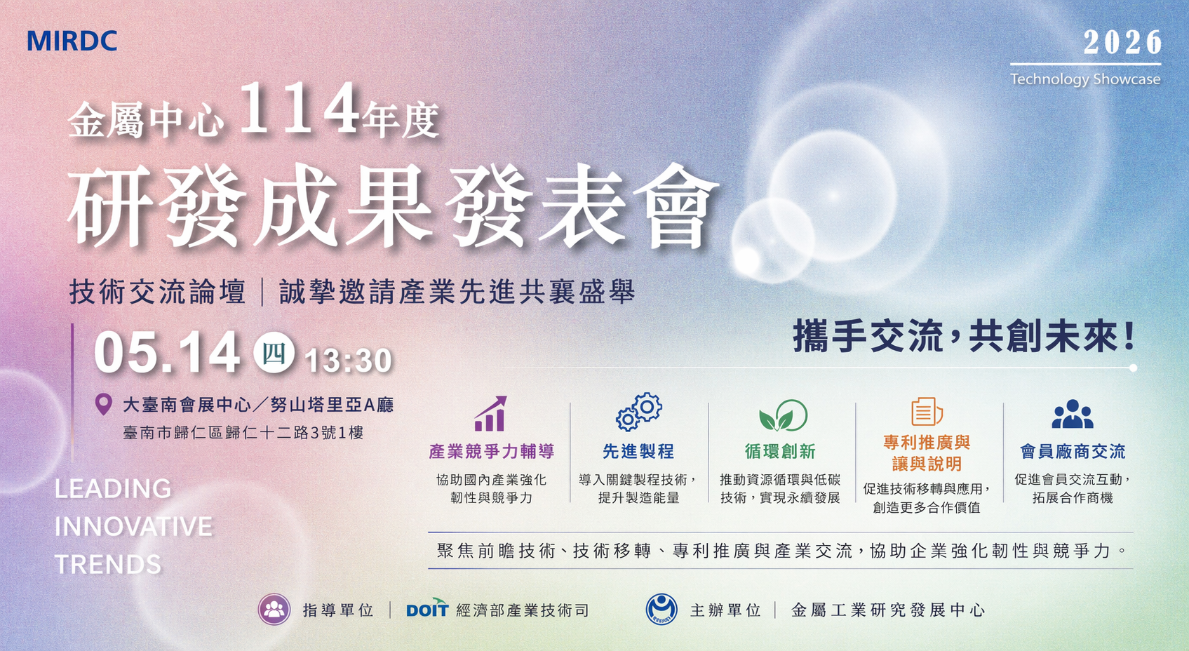 三、 同期重量級論壇:金屬中心「114年度研發成果發表會」 開展首日(5/14)下午,大會特別攜手金屬工業研究發展中心舉辦專業論壇。內容將聚焦三大主軸,為企業注入創新活水: 📌 發表六大前瞻技術:涵蓋「先進製程」與「循環創新」的最新技術與專利推廣。 📌 產業競爭力輔導團專講:特邀專家剖析如何善用政府資源,協助企業進行 AI 數位轉型與技術輔導,強化競爭韌性。 📌 金屬中心攤位專屬導覽:論壇會後將特別安排專人帶領與會者,深度導覽「金屬中心」的專屬攤位展出內容與技術精華。