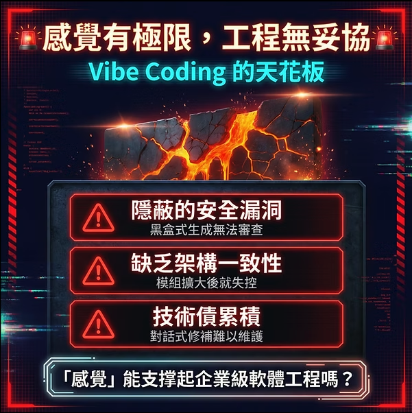 如果只學會 Vibe Coding ,開發者雖然能獲得極高的開發速度,但這種「黑盒式」的開發卻隱藏著巨大的技術債。當專案規模擴大,單純依賴反覆Prompt的對話式修補會逐漸失控。生成的代碼可能存在隱蔽的安全漏洞,且缺乏一致性的架構邏輯。