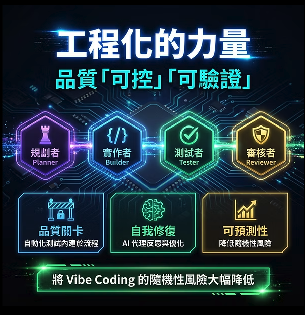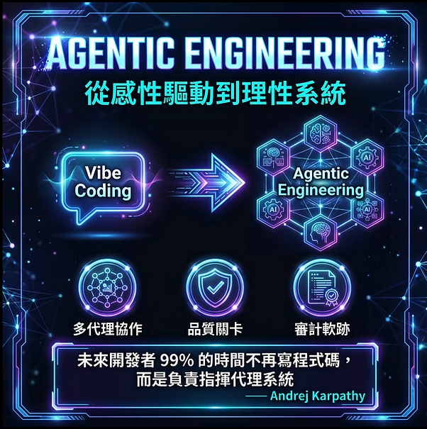 所謂「智能體(Agentic)」,指的是開發者不再親手撰寫大部分程式碼,而是負責協調多個 AI Agent,由這些代理系統負責規劃、實作與測試;而「工程(Engineering)」 則強調,這並非隨意生成,而是一門結合專業經驗的軟體工程技術。