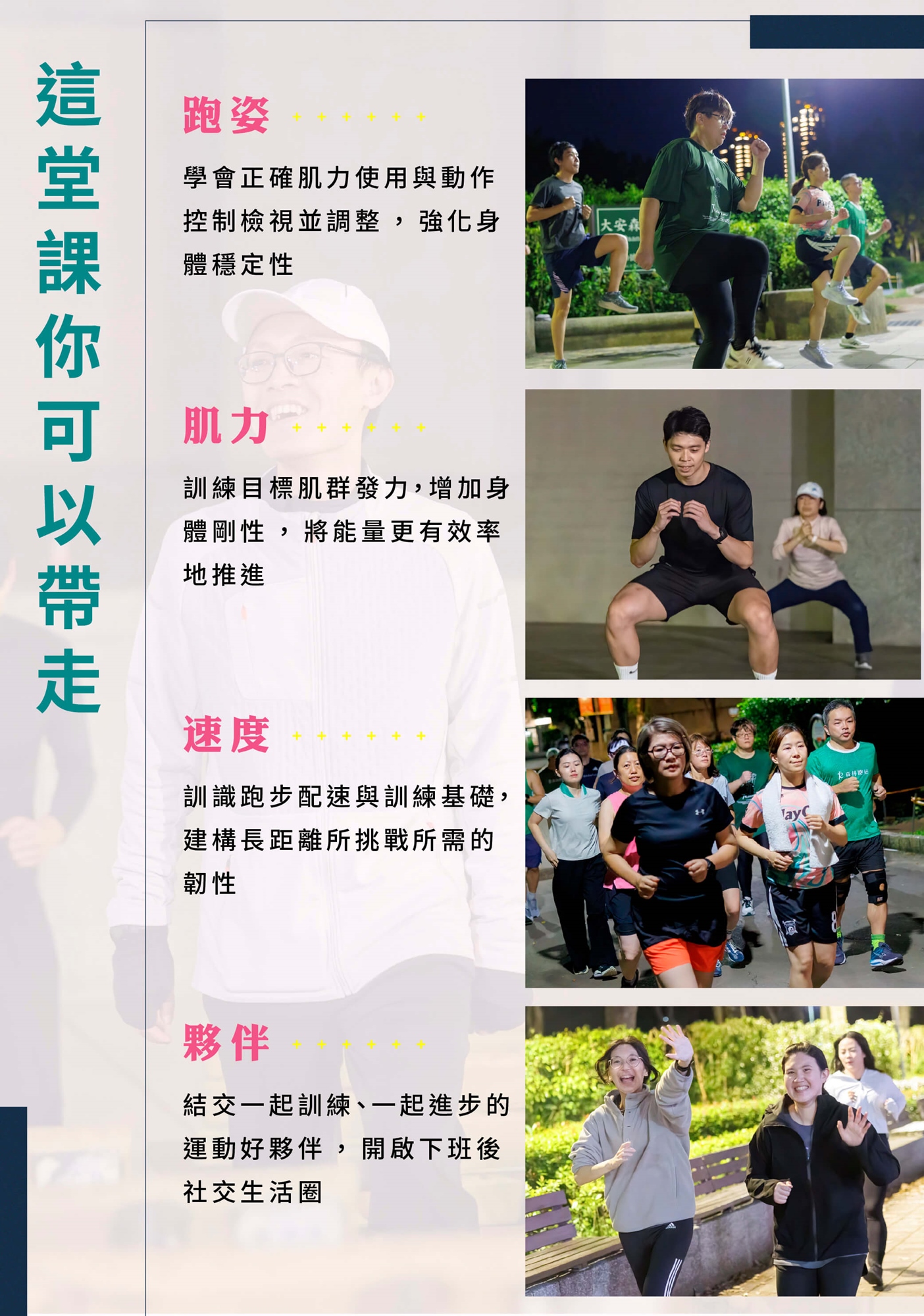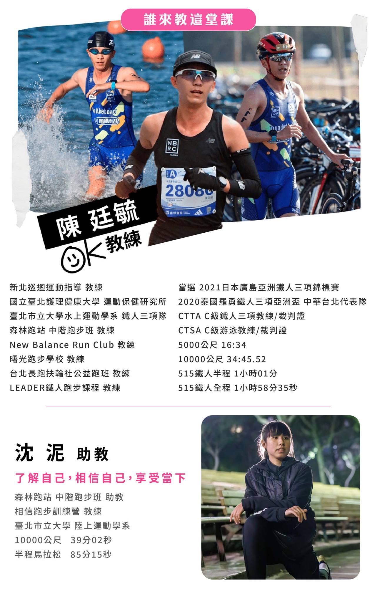 週一班有最親切細心的 #陳廷毓 #OK教練 和 #沈泥 助教,帶你從跑姿基礎到核心訓練,認識速度遊戲,陪你提升跑步耐力,避免運動傷害,跑得健康又安心😉