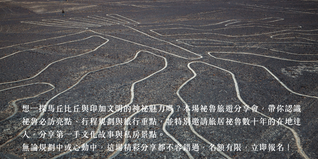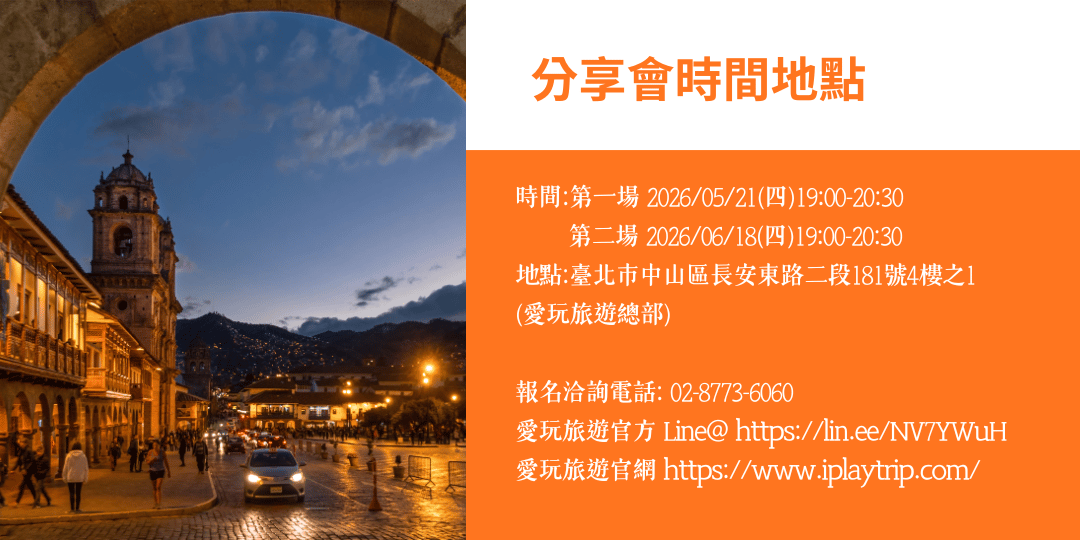 本場祕魯旅遊分享會,將深入介紹祕魯必訪景點、祕魯達人Ema協助規劃的行程重點與旅遊亮點,帶您了解真正的祕魯樣貌——哪些地方值得一去再去、哪些細節最容易被忽略、如何玩得安心又精彩,通通一次公開。