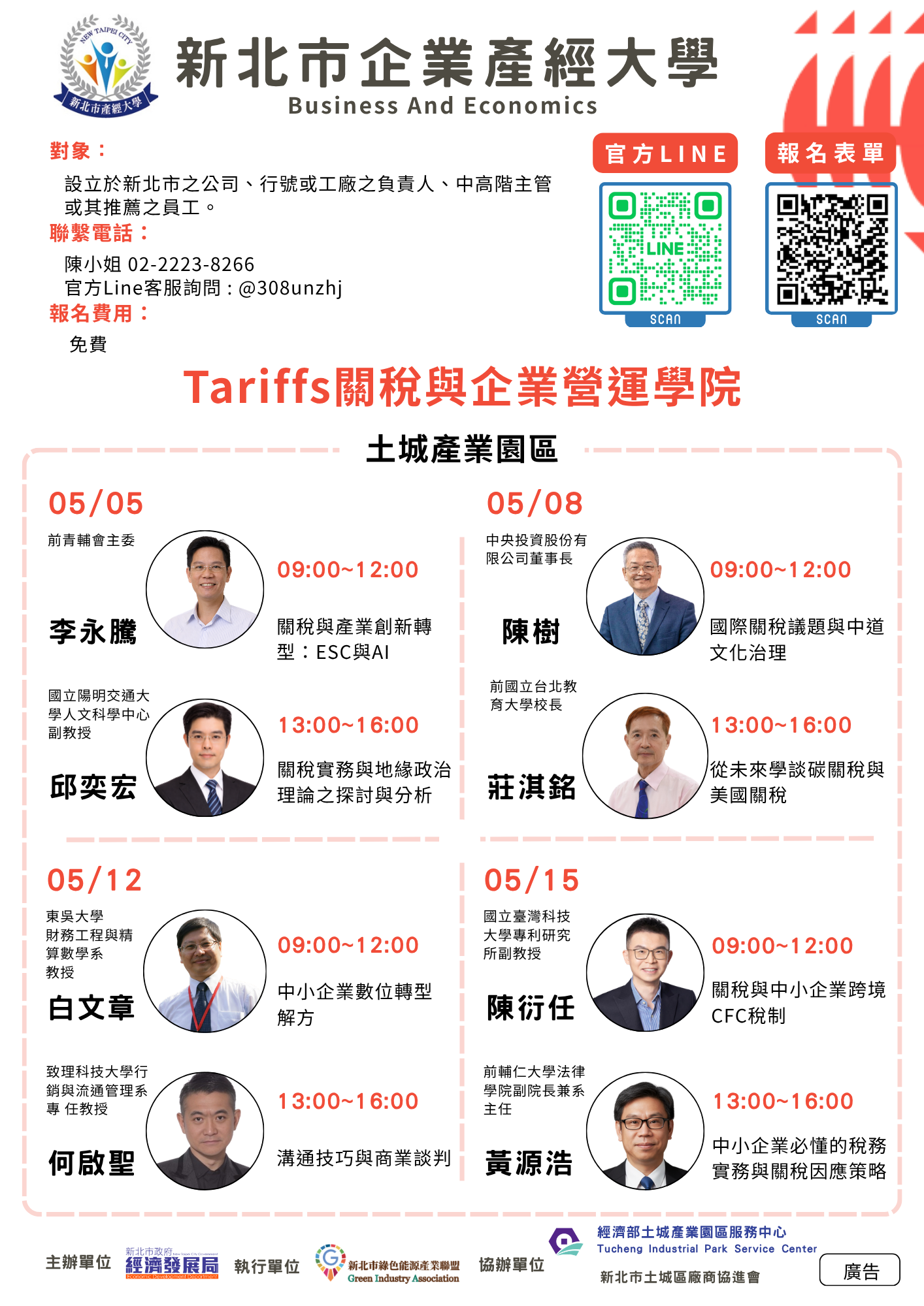 新北市企業產經大學-【免費實體課程】-05/05-05/15【土城產業園區】Tariffs關稅與企業營運學院