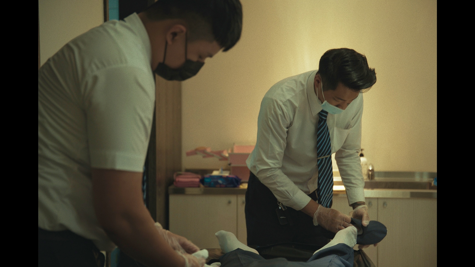 殯儀館內,禮儀師細述流程,家屬凝神傾聽,幼童遊樂其間。新進員工進出備物,學習清洗與上妝。大體冰存年限已屆,同仁集資火葬,用自己的方式送別。