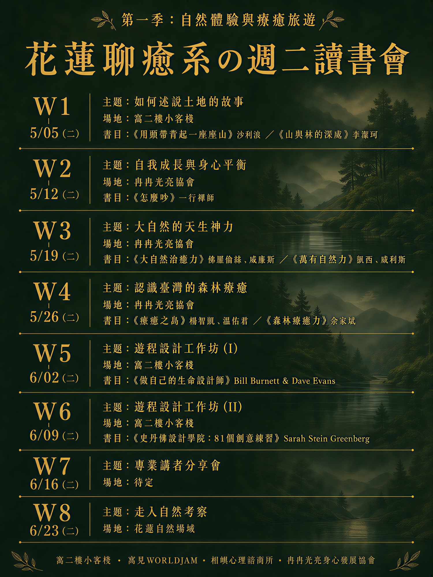 這一季,我們聚焦「療癒旅遊與自然體驗」,透過 4 場讀書會、2 場工作坊、1場分享會與 1場走進自然的實地考察,邀你一起共創花蓮的療癒遊程。