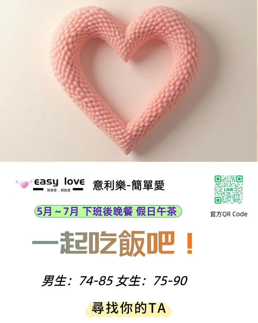 這是一場專屬於單身男女的浪漫約會!我們希望幫您找到那個特別的人,一起分享美食、故事和未來。不論你是害羞還是外向,這裡都有屬於你的機會!