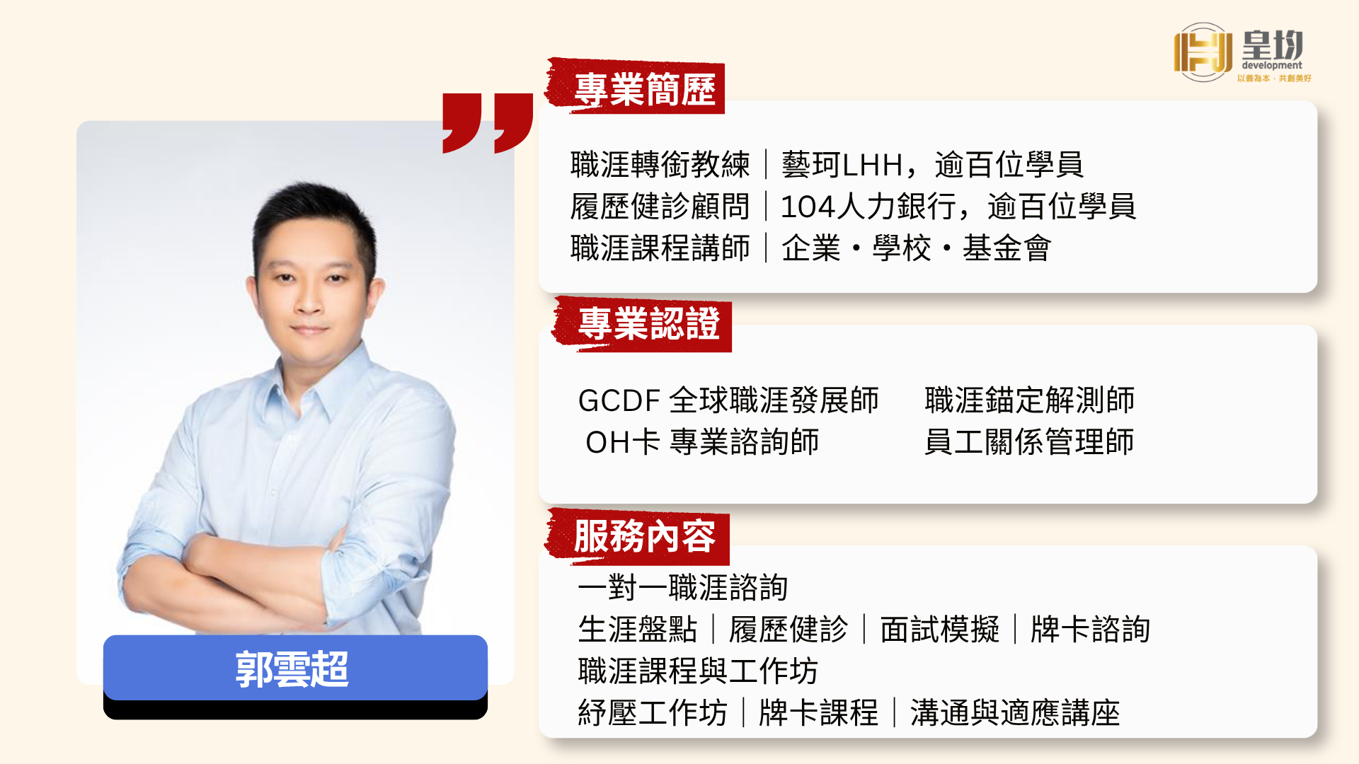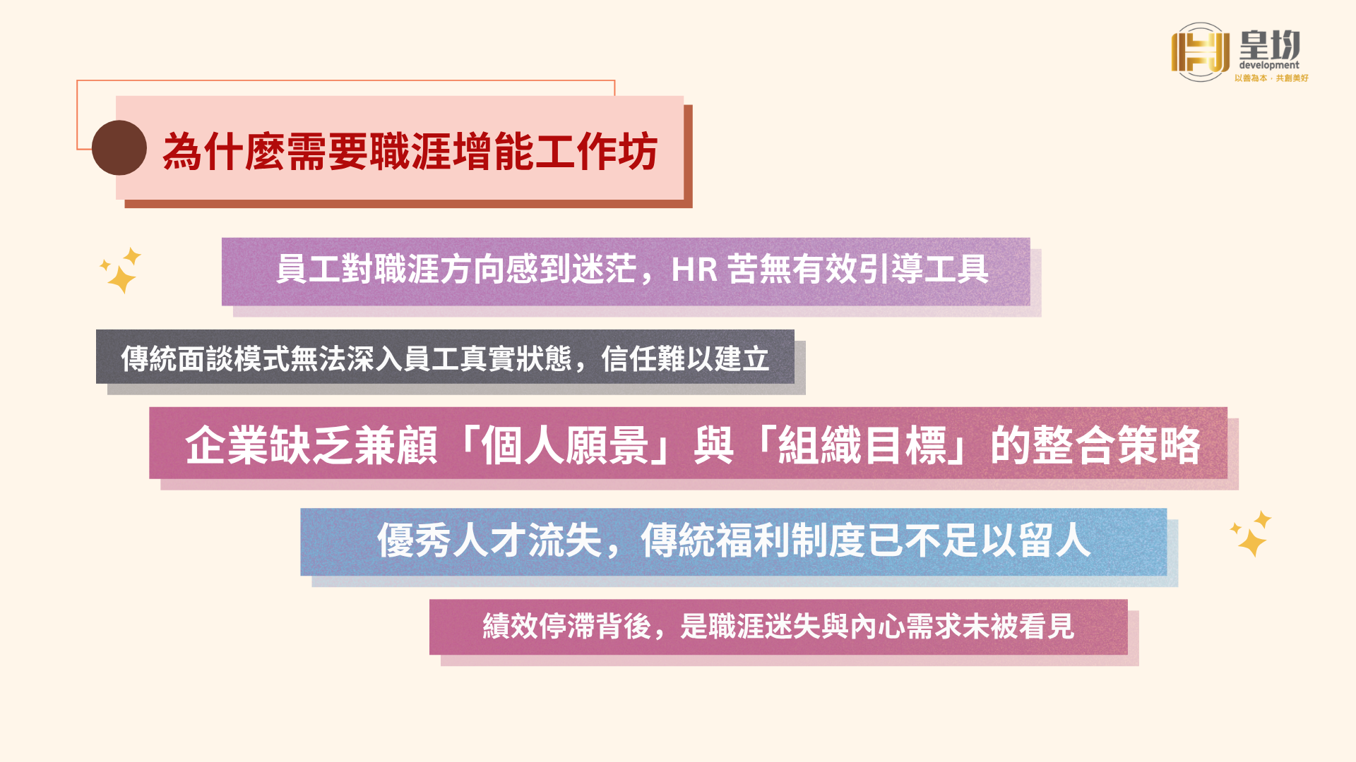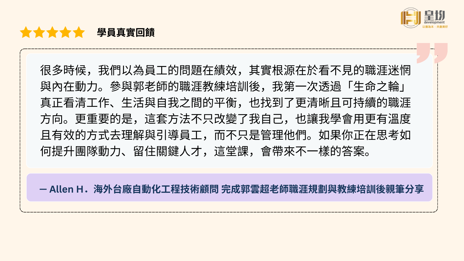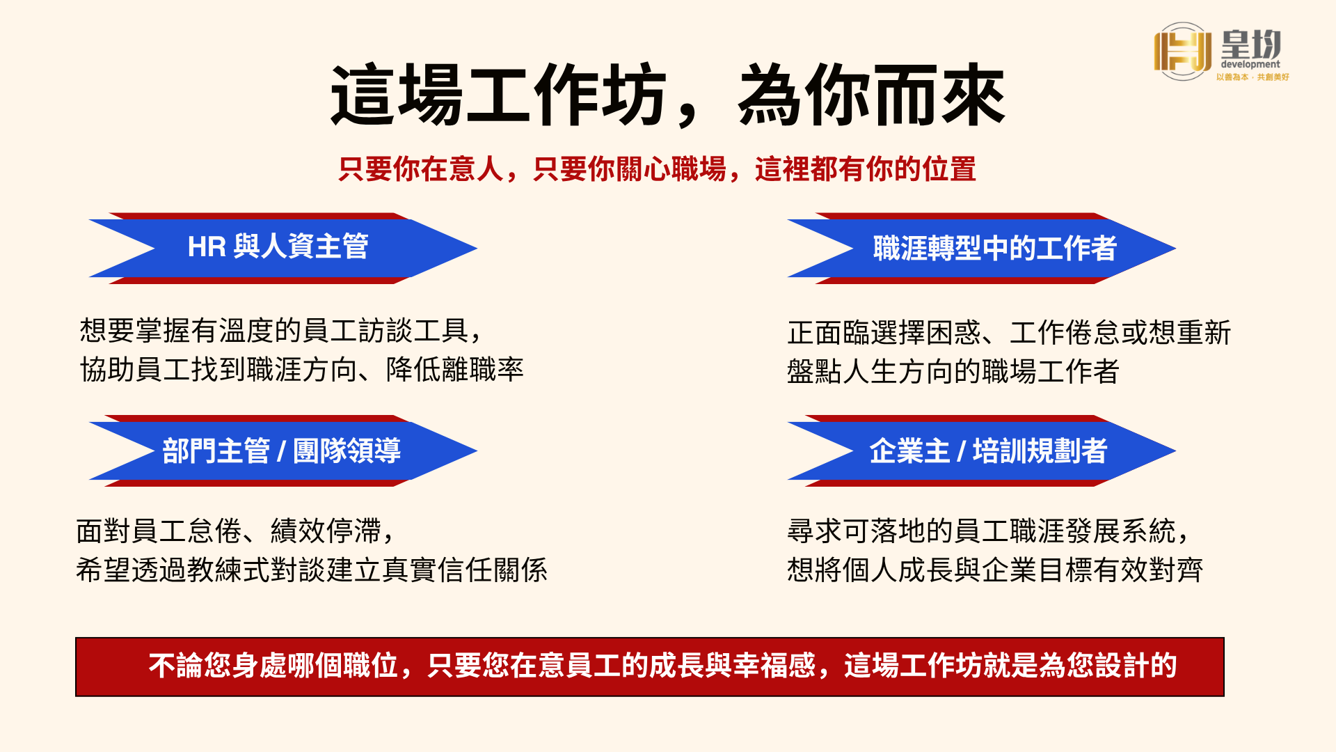 | 🏢 企業主 / 培訓規劃者 | 評估如何將此工作坊導入企業內部職涯發展系統 |