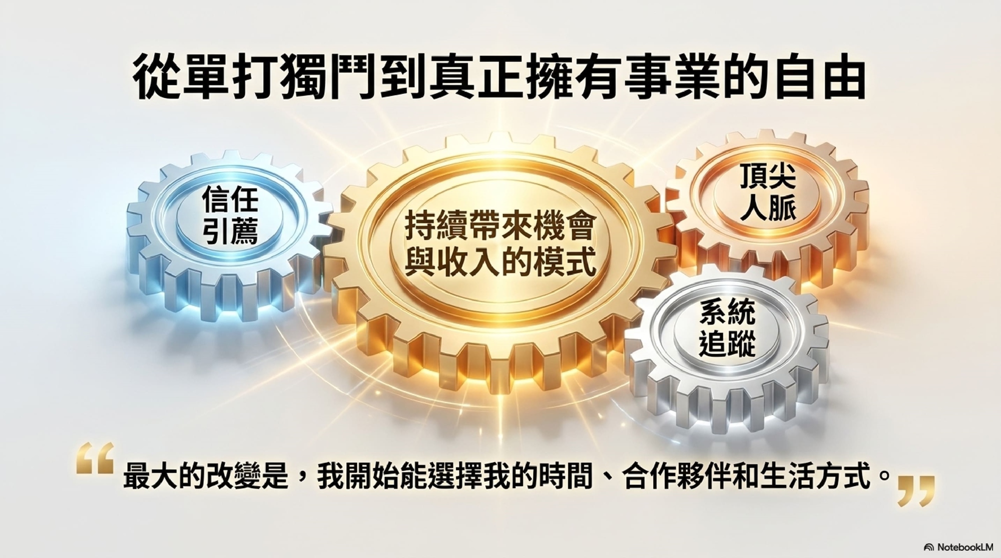 「我從單打獨鬥到擁有自己的事業,最大的改變是,我開始能選擇我的時間、合作夥伴和生活方式,並且建立出一套能『持續帶來機會與收入的模式』。」