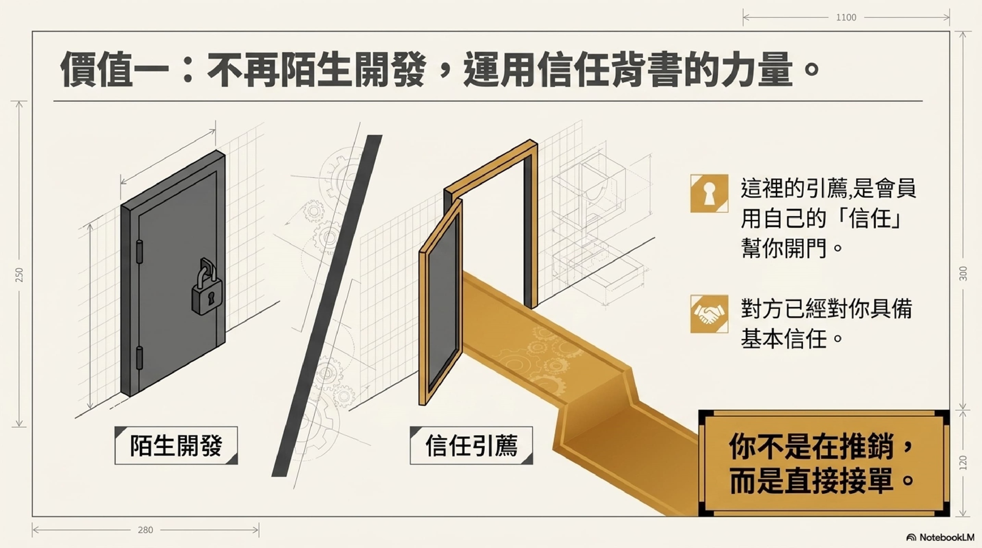 在這裡,我們不玩互相推銷的零和遊戲,而是透過深度信任的建立,讓每一位會員都成為彼此的「超級業務員」。