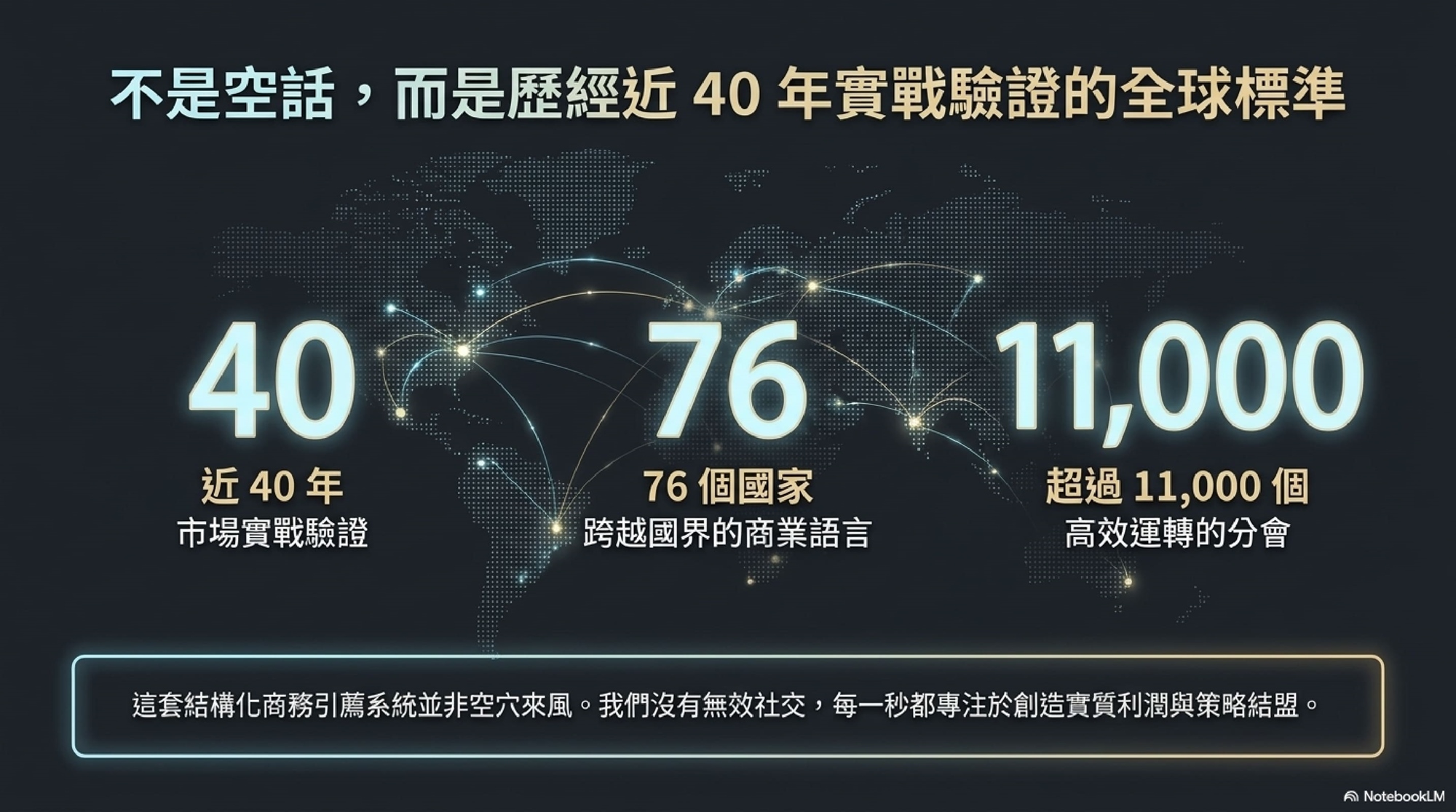BNI 系統已經在全球 76 個國家、超過 11,000 個分會,歷經近 40 年的市場實戰驗證,被實戰證明是目前最有效的結構化商務引薦系統之一。
