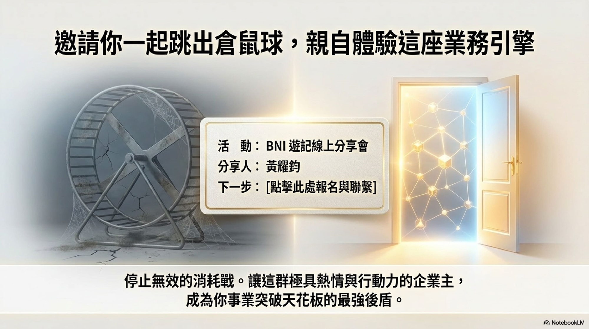 但為了幫助你跳出不斷努力卻又一直原地踏步的倉鼠球中,我想邀請你來參加我的 BNI 遊記線上分享會。
