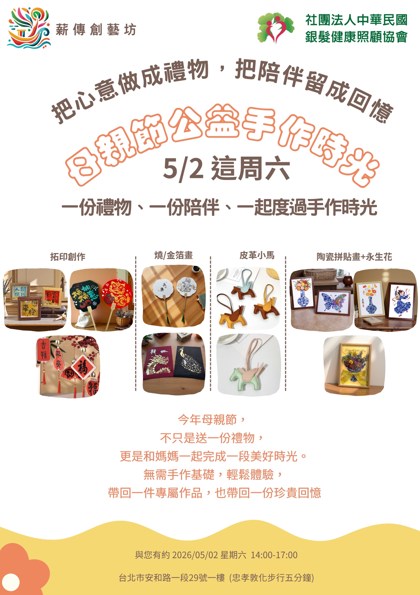 『薪傳創藝坊 』與 『社團法人銀髮健康照顧協會 』 邀請您透過手作,為媽媽、為家人,也為自己,創造一份獨一無二的節日回憶。