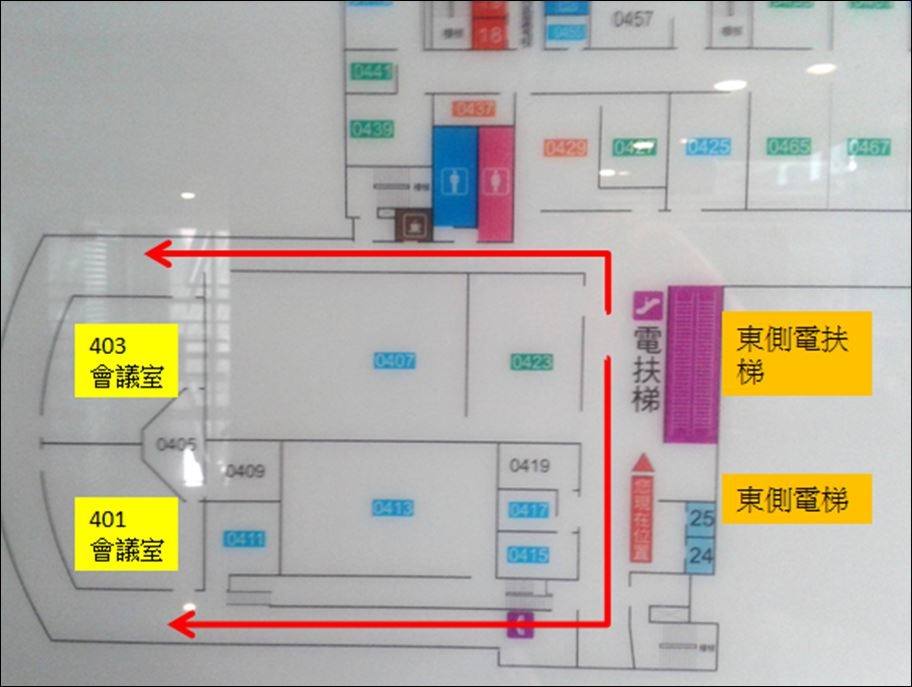 403 會議室:由1F市府大廳,往東門方向,可搭乘東側透明電梯/手扶梯至四樓,沿箭頭路線可至。