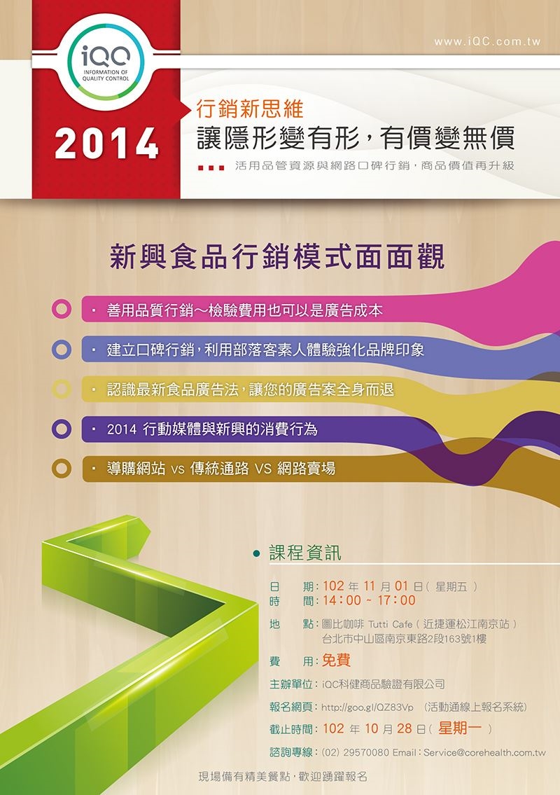 傳統行銷模式已死?!行動裝置普及徹底改變人們的行為模式,身處群眾對食品安全不信任的氛圍,如何讓消費者看到你對品質的用心?品管報告成本很高嗎?可是消費者與下游廠商都要看!如何讓每一分投資發揮最大效用?重拾黑心商品陰影下,消費者對台灣品牌的信心。 把握先機脫穎而出,你,準備好了嗎?
