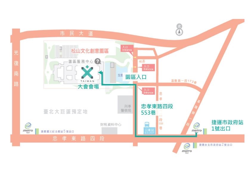 因光復南路入口施工封閉,請前往本園區參加活動之貴賓,改由忠孝東路四段553巷進出。