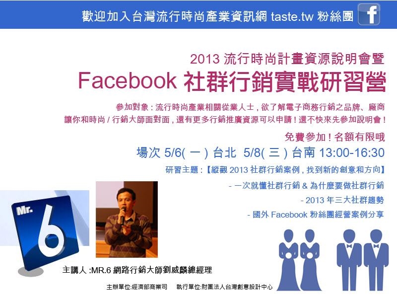 由經濟部商業司主辦,台灣創意設計中心執行的2013流行時尚產業科技應用與高值化輔導推動計畫,將於5/6、5/8於台北、台南舉辦兩場計畫說明會。本次研習營邀請到MR.6網路行銷團隊創辦人劉威麟總經理分享社群行銷術,由社群趨勢到國際案例,讓您用小經費做大品牌!