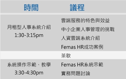 當美國企業能夠輕鬆享受先進的Workday、Zenpayroll等便利的雲端人事系統時,台灣的小型、微型企業也能夠以低風險每月輕鬆繳享有企業級雲端人力資源管理系統了。鋒形科技有限公司累積了多年的人事薪資、差勤排班、差假線上簽核等企業內部私有雲端人力資源系統等規劃、開發、建置經驗後,於2012年下半年推出了公有雲(Public Cloud)「Femas HR雲端人力資源系統」。公有雲服務的最大好處是不必一次花大錢採購系統、軟體能夠持續升級、不綁約、免維護、免設備、無隱藏費用(如電費、維修費)。讓中小企業終於也能使用大企業的人事系統了!鋒形科技邀請您04/12(五)一同來了解雲端服務可以如何提升中小企業的人事管理效率,並會在說明會中現場示範、展示、操作系統,讓您有更深入的了解!