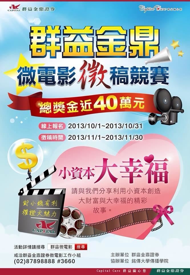 同學們!告訴你一個能獲得獎金十萬元的好消息!快來拍攝「群益證券微電影」,第一名獎金為10萬元,總獎金更接近40萬元!透過影片內容告訴大家小資本如何變成大財富,內容需要與權證相關,並發想一句Slogan,影片長度三分鐘至五分鐘,此次比賽特別延到十一月三十號(六)完成報名,十萬元的獎金得主有可能就是你!千萬不要錯過,趕快來參賽!詳情請見活動官網:http://www.capital.com.tw/Activity/weifilm/