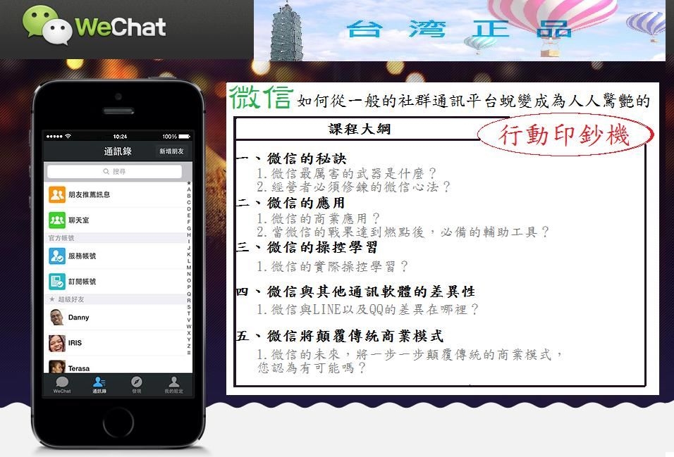 [微信] 如何從一般的社群通訊平台蛻變 ~ 成為人人驚艷的行動印鈔機 1.微信最厲害的武器是什麼? 2.經營者必須修鍊的微信心法? 3.微信的商業應用? 4.當微信的戰果達到燃點後,必備的輔助工具? 5.微信的實際操控學習? 6.微信與LINE以及QQ的差異在哪裡? 7.微信的未來,將一步一步顛覆傳統的商業模式,您認為有可能嗎? 免費報名 : http://goo.gl/jLfrVl