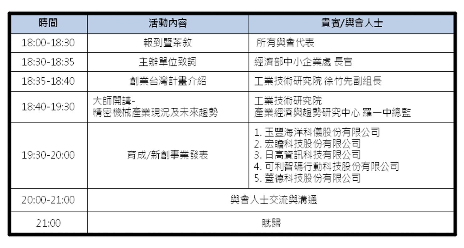 創業台灣天使俱樂部共策劃一系列十二場,以不同產業主題來區分,並邀請各產業中的佼佼者分享經驗。此次將以ICT及精密機械產業為主軸,一直以來台灣的ICT產業都位居全球極重要的地位,目前不僅有多項ICT產品高居全球產值/產量第一,也是全世界舉足輕重的研究重鎮,加上全球 IT 產業持續朝著委外代工及降低成本的趨勢前進,台灣ICT產業的重要性更可說是無庸置疑;過去台灣由未開發的國家進入開發中國家,精密機械業就扮演著關鍵性的角色。雖然目前精密機械工業的產值佔全國產值已非重要比率,但我國機械產品的總出口值,於全球排名仍有相當不錯的成績,且精密機械產業仍然扮演著其它高科技產業發展之關鍵角色。
