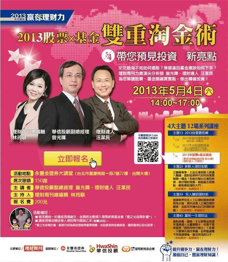 曾光輝老師擁有多年「太極操盤法」實戰操作經驗,擅於運用股市所累積的陰陽力量和留下的痕跡,透析多空及盤整型態,掌握趨勢及制勝反轉型態,預先研判股票未來多空走勢和價格。汪潔民老師是美國斐利迪克遜大學企業管理碩士,專攻計量經濟及行銷策略,熟稔各種投資工具,深諳國際總經局勢,從資訊解讀研判投資策略,被譽為「宏觀大師」。兩位老師各有擅長,五月講座要教各位投資朋友從股票、基金分進合擊,掌握第2季布局良機,穩穩淘進一桶金。