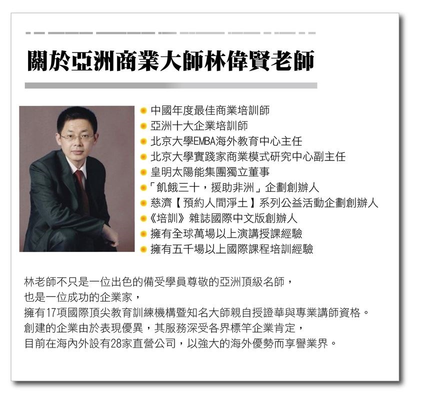 一直擁有夢想,希望某天擁有自己的產業,成為卓越的管理者;一個企業主,不斷追求自己企業的成長壯大;雖然已經是一名成功的企業家,卻覺得人生乏味,抱怨生活的時間被工作占滿了…您的夢想和問題都能在這裡找到答案。
