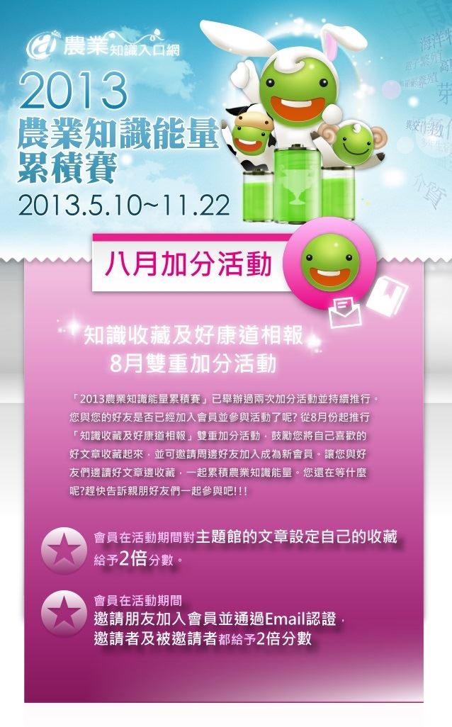 「2013農業知識能量累積賽」已舉辦過兩次加分活動並持續推行。您與您的好友是否已經加入會員並參與活動了呢? 從8月份起推行「知識收藏及好康道相報」雙重加分活動,鼓勵您將自己喜歡的好文章收藏起來,並可邀請周邊好友加入成為新會員。讓您與好友們邊讀好文章邊收藏,一起累積農業知識能量。您還在等什麼呢?趕快告訴親朋好友們一起參與吧!!!