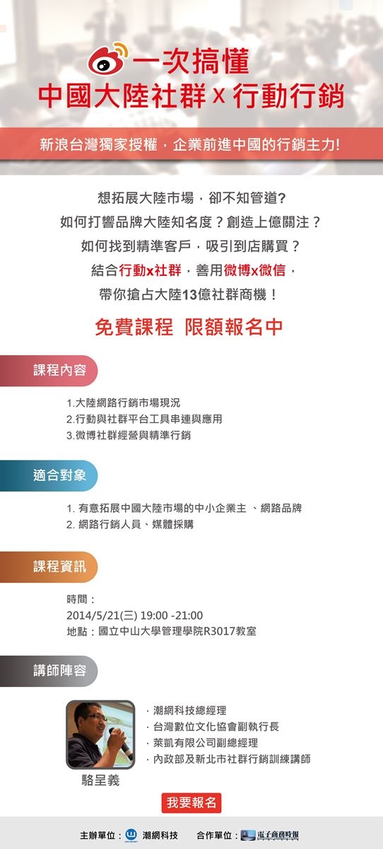 ● 限公司行號報名,報名時請填公司名稱,否則不予受理。 ● 報到時請帶名片入場! 主辦單位:潮網科技有限公司 主辦單位保留講師議程與報名確認之權利 若有任何問題,請洽蔡小姐 (02)8768-3898 #330 或 vickytsai@wavenet.com.tw