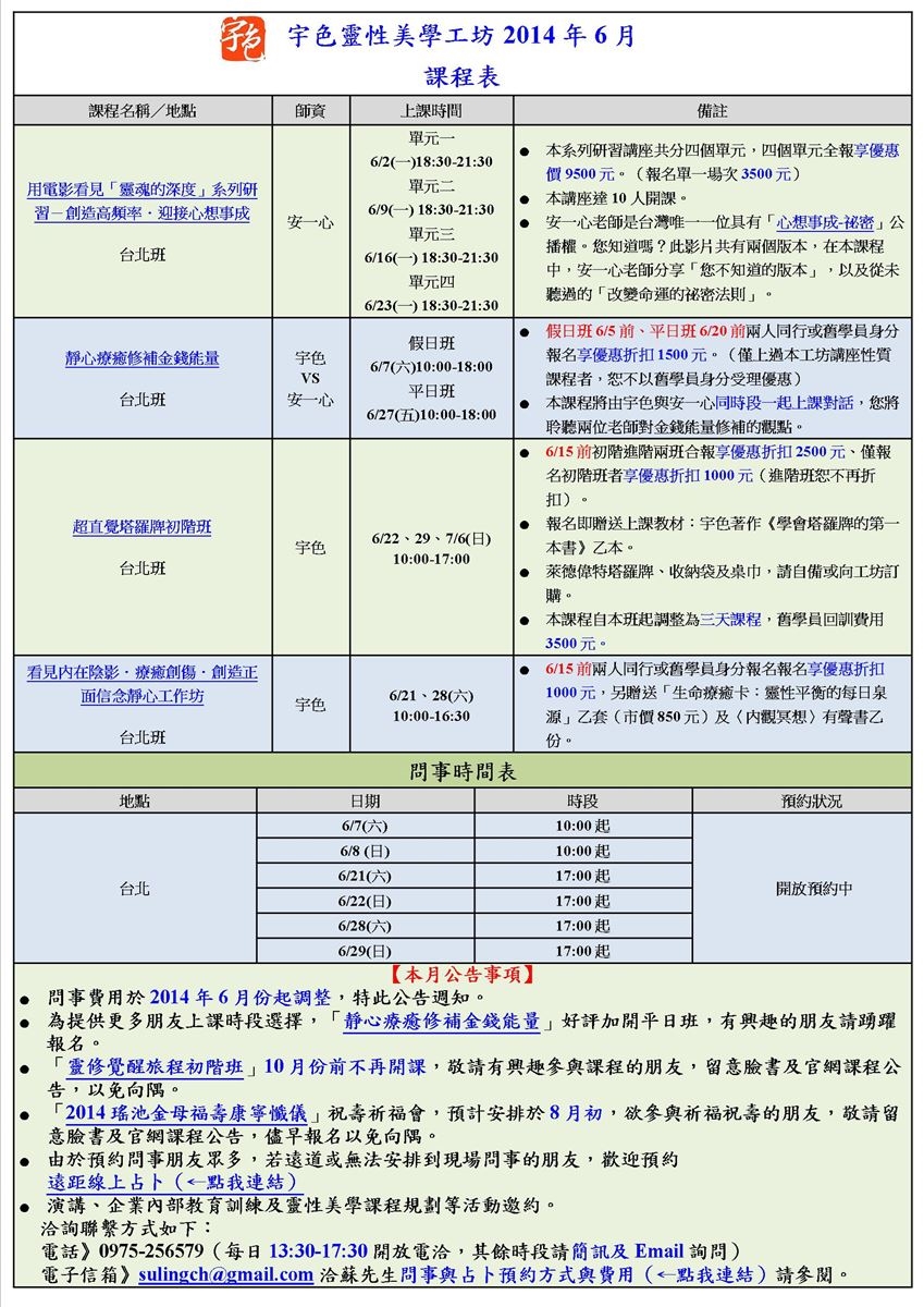 宇色靈性美學工坊2014年6月課程暨問事時間表