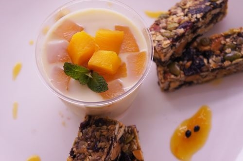 迎接夏季芒果季,加入清爽的豆漿奶酪,再搭配以來春嬤麥芽製成的綜合果仁活力棒,養生又充滿活力的健康茶點。