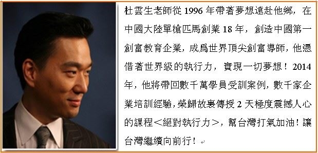 有人問我,杜老師你精通銷售、演講,爲什麽這次選定執行力這個主題?因爲我知道台灣人民最需要的不是銷售、領導、策略、演講、激勵,台灣人民現在最需要的是真真正正的執行!執行!還是執行!