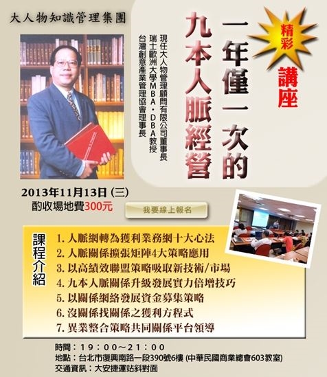 這一切的疑問,范揚松教授 都將在本講座為您娓娓道來嘆為觀止獨家方法,讓你擴充您的九本人脈,從此錢充百脈獲利滾滾!!