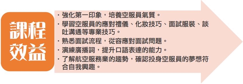 從氣質培養、應對禮儀、化妝技巧、面試形象、個人性格分析、談吐強化、溝通技巧,到產業的發展,以及未來生涯規劃的建議,能在五次課程當中,讓您脫胎換骨,信心倍增,順利Pass競爭激烈的空服員面試!