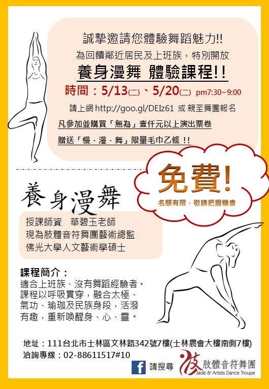 課程地點:肢體音符舞蹈中心(台北市士林區區文林路342號7樓(南側)適合對象:成人、上班族