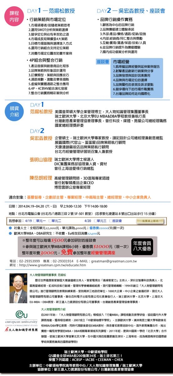 *活動通僅限報名、費用現場繳交 *2天8000元、1單元3000元 *退費注意事項:利用活動通報名完成以後,若當天無法參加,可以在月底申請退費 電話: 02-29353999 地址: 台北巿文山區羅斯福路5段88-5號5樓 (師大分部旁)