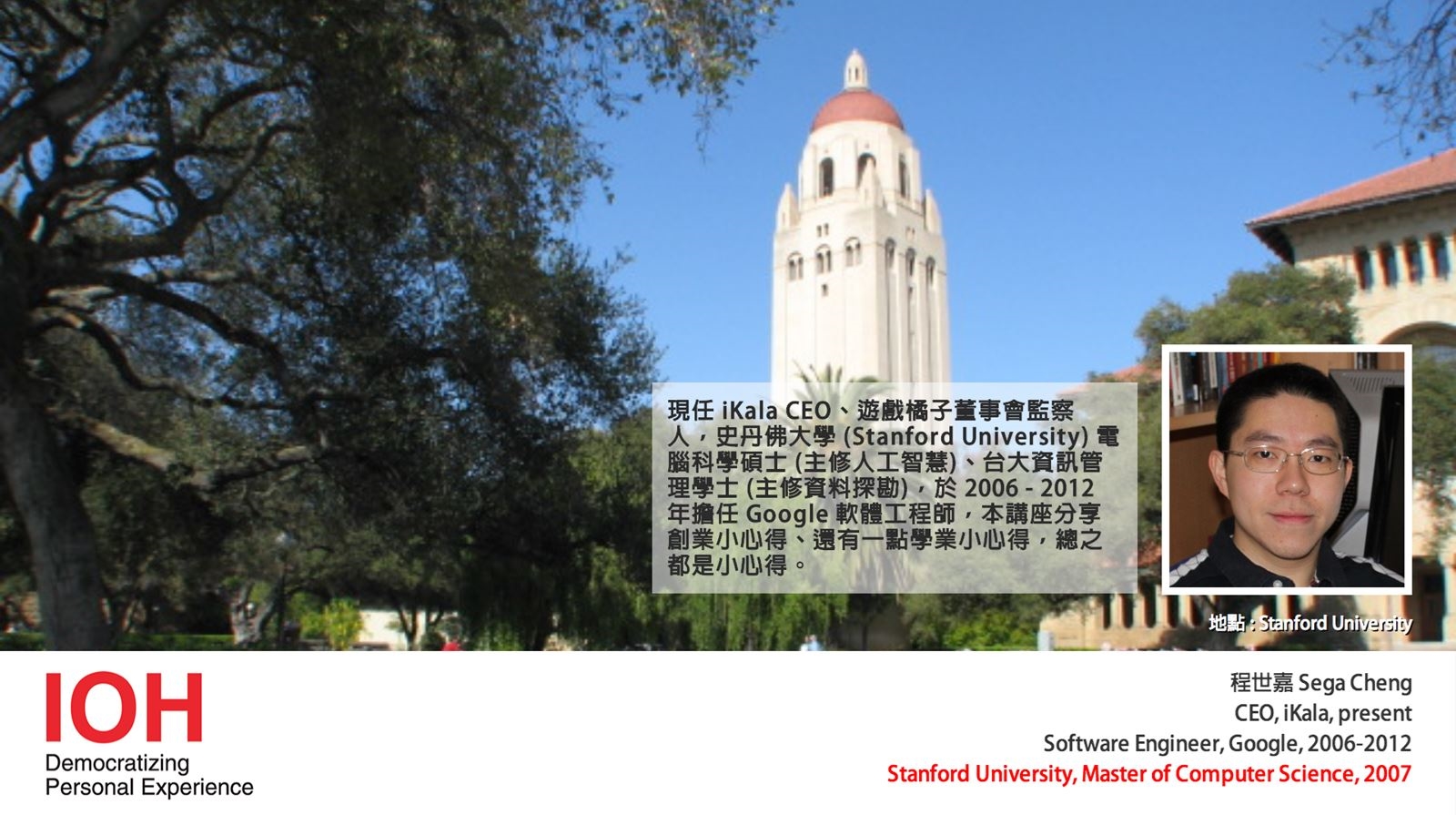 第二場 IOH X AIC 講座,開始報名囉!這回 IOH 特別請到現任 iKala 互動媒體與 Livehouse.in 執行長 Sega 程世嘉,與各位分享,他在人稱矽谷創業搖籃的 Stanford 攻讀 CS 的求學經驗、在矽谷感受到的創業能量,還有在 Google 六年與現今在 iKala 的創新創業心得。名額有限,大家動作要快,趕緊報名才有位子坐噢!