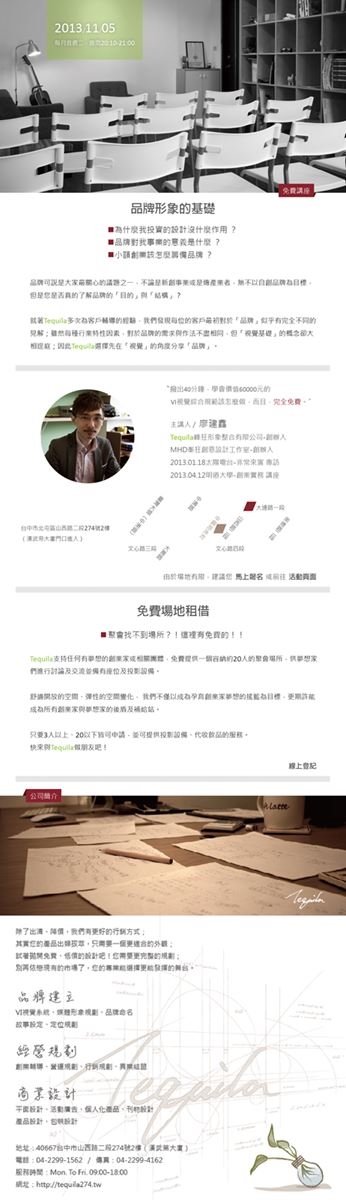 為什麼我投資的設計沒什麼作用 ? 品牌對我事業的意義是什麼 ? 小額創業該怎麼籌備品牌 ? *撥出40分鐘,學會價值60000元的VI視覺綜合規範該怎麼做,而且,完全免費。 只要您是: 欲創業者,正苦思新創事業的設計、 新創業者,正找尋適合的事業形象、 企業經營者,正籌措事業新風貌、 對於設計規劃有興趣者 歡迎您立即報名。 講座40分鐘、10分鐘自由交流,共計50分鐘。 講座準時開始,請您提早10分鐘入席。