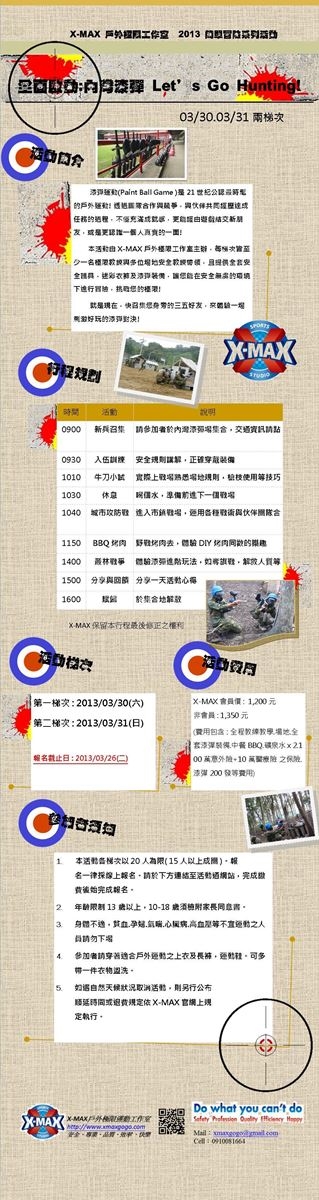 • 如因為不可避免之天災人禍導致活動因安全考量須取消者(如:颱風、暴雨、地震…等),會由X-MAX接案人統一發通知給活動連絡人取消活動,聯絡人有權可選擇延期或退費(需收取行政費用200NT)。