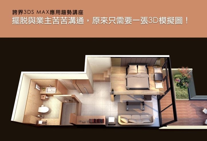 3D示意圖適合擬真呈現室內空間及家具配置、商品包裝提案、產品概念模型、展場動線規劃、更包含MV影片的3D物件等,想開始認識接觸3D表現工具,絕不可錯過這一場由蘇世安老師主講-3dsMax四大面向”型、影、色、框”的精彩跨界應用趨勢講座。