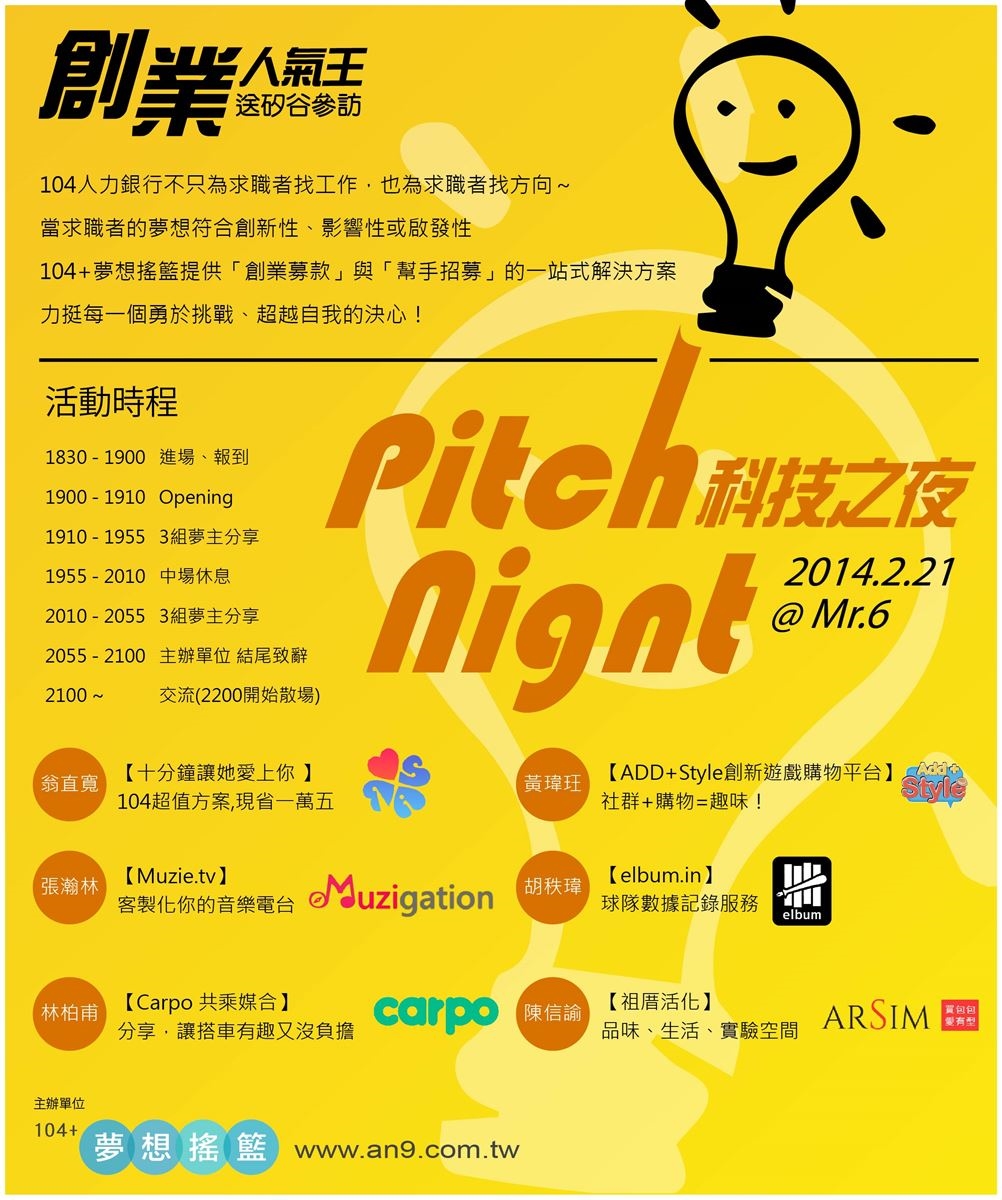 為期五個月的「創業人氣王‧送矽谷參訪」活動,已通過網路票選,最高前12名團隊進入「104 夢想搖籃」進行募資。Pitch Night廣邀大家來一同來擔任夢想推手,聆聽這些團隊的計畫、見證他們的成長!