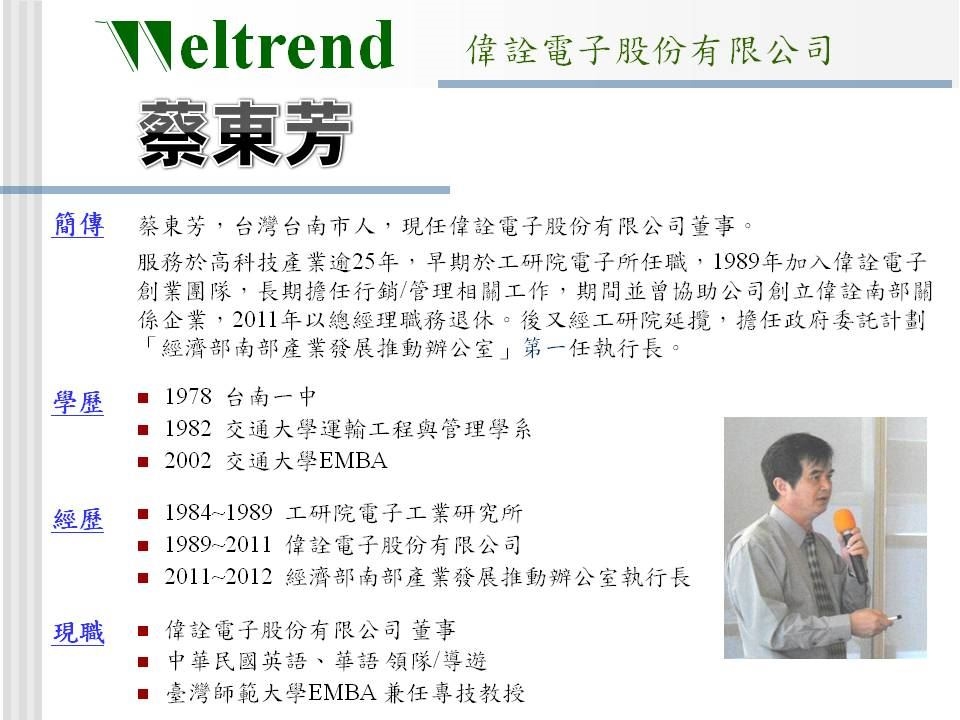 主講人:蔡東芳 | 偉詮電子董事 (前經濟部南部產業發展推動辦公室執行長) |