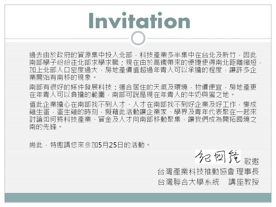 擬藉此活動讓企業家、學界與青年代表聚在一起來討論如何將科技產業、資金及人才向南部移動聚集,讓我們成為開拓國境之南的先鋒。