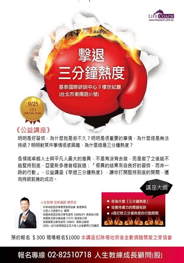 公益講座【打敗三分鐘熱度】,讓你打開堅持到底的開關,邁向持續前進的成功。