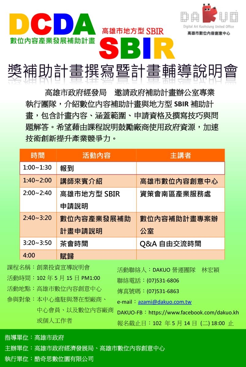 高雄市政府經發局  邀請政府補助計畫辦公室專業執行團隊,介紹數位內容補助計畫與地方型SBIR補助計畫