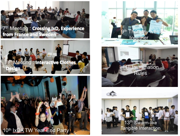 從2010年成立以來,IxDA Taiwan 建立了一個無形但緊密的平台,透過次的活動,交換著專業的知識以及分享彼此的生活經驗。IxDA Taiwan 每個月都會舉辦一次互動設計聚會,核心「激發創意思維」,每次的活動都會規劃有趣的互動設計工作坊,我們不僅將專業的互動設計方法帶給參與者,也讓所有參與者擁有難能可貴的互動體驗。我們相信只有透過真實的互動經驗才能夠將互動設計的衝擊真正帶回給台灣的社會以及產業界,並藉此讓互動設計真正的生根台灣。