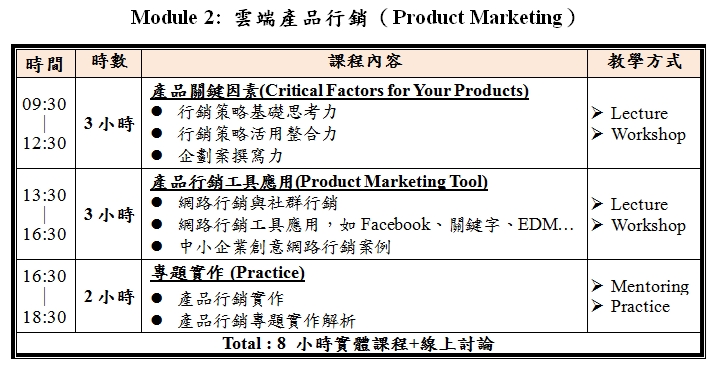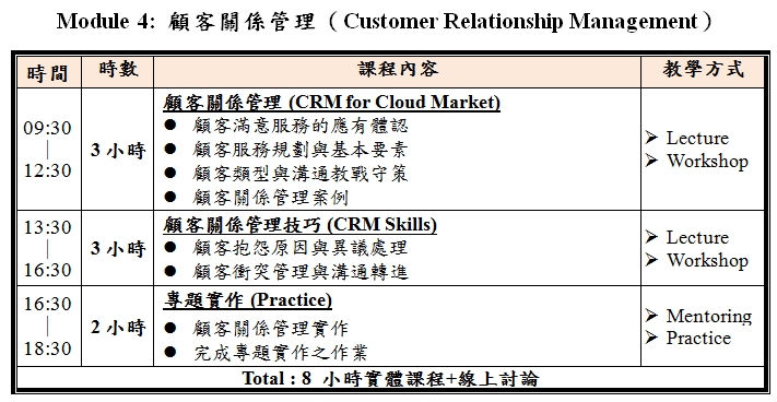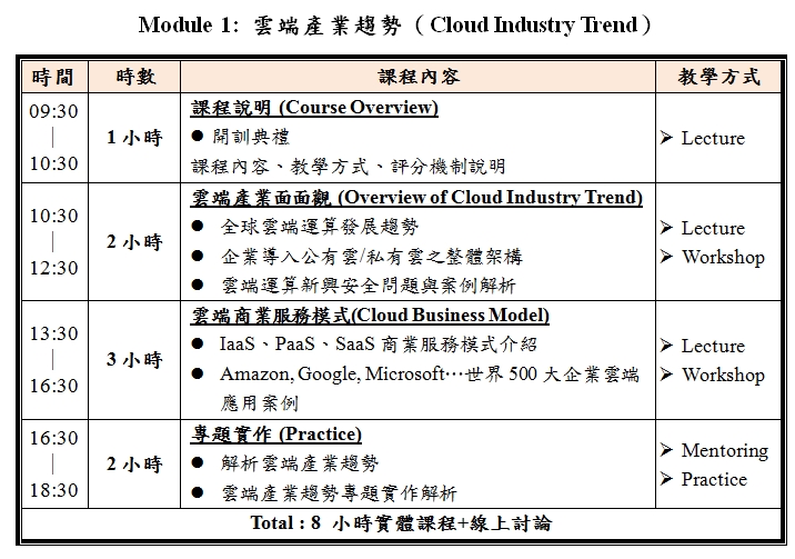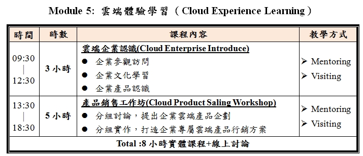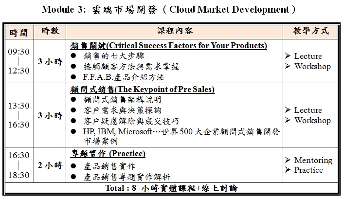 課程時間:102/9/30(一)~102/10/4(五) 09:30~18:30 課程時數:40小時 課程地點:中國文化大學推廣部大新館(台北市延平南路127號B1) 課程對象:具國內外大專以上學歷者、欲就職或轉職成為雲端業務工程師者。 報名網址:http://ptt.cc/mIKh 課程模組:共有5大模組課程,包含雲端產業趨勢、雲端產品行銷、雲端市場開發、顧客關係管理、雲端體驗學習等。