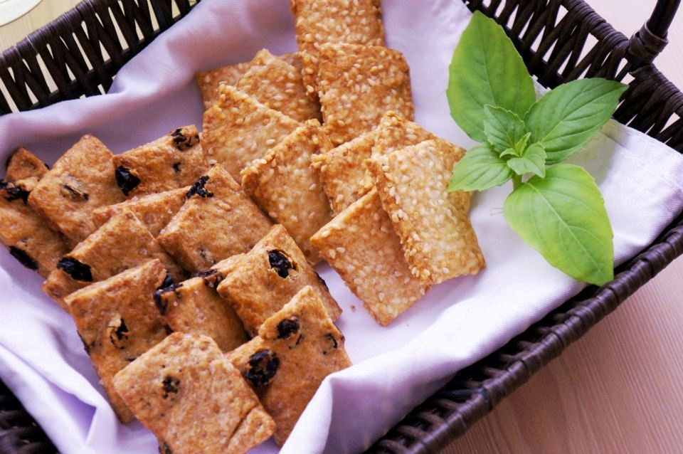 切成方塊狀的薄餅,用葡萄籽油代替奶油,主角是全麥麵粉及芝麻粒,夠健康吧!