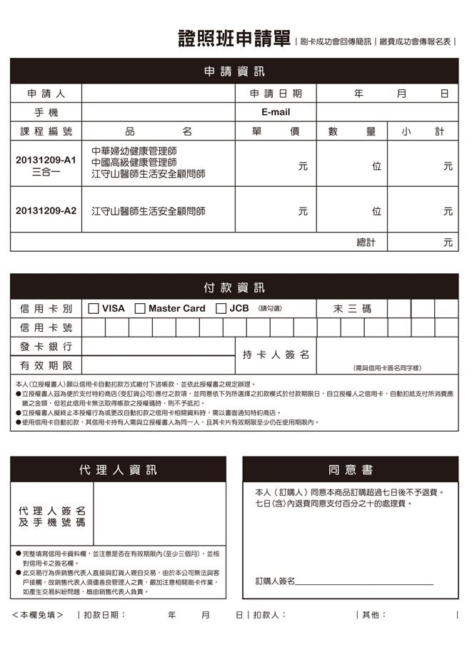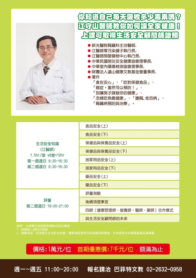 上課日期&時間 :2014/3/23 (日) 09:30-16:30 ,2014/3/30 (日) 09:30-21:00 原價 一萬元 / 位 ,首期優惠價 ˙7000元/位 數量有限 額滿為止!!!!! 單筆兩位同時報名再加贈 江守山醫師 <食在安心> 書兩本!!!!! 完成線上報名後,請下載下列證書申請書,填寫資料及繳費方式後寄到 buffett.roy@gmail.com